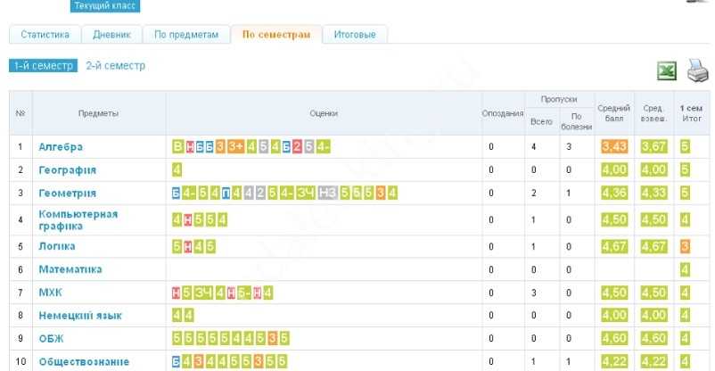 В этой вкладке можно посмотреть отметки за четверть/триместр/семестр по всем предметам, которые преподавались в заданном отрезке времени (можете выбрать сами).