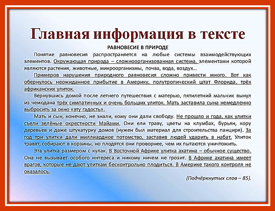 Чаще всего главная информация передана в тексте в нескольких предложениях, которые важно уметь видеть и находить