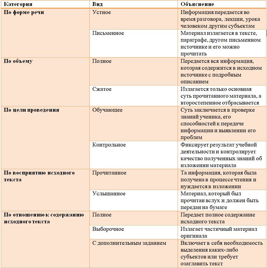 Иными словами, изложением называется любое перенесение информации на бумагу в сжатом или полном виде после услышанного или прочитанного текста. Чаще всего встречается сжатое изложение, то есть такое, в котором необходимо передать только самую главную информацию, а второстепенную отбросить.