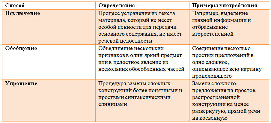 Чтобы правильно убирать ненужную информацию требуются знания определенных правил и методов сокращения. Их всего несколько, но каждый из этих способов можно применять на практике во время написания сжатого изложения.