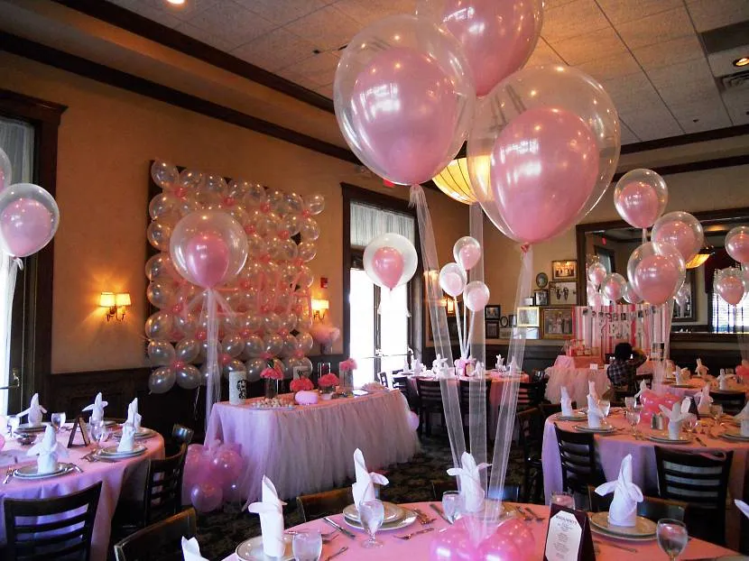Праздничный зал можно украсить воздушными шарами, стильно смотрится сочетание розовых, черных, серебристых, прозрачных шариков различных форм.