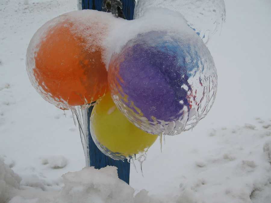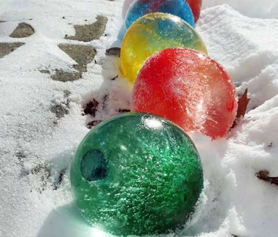 Размещаем наполненные водой шары на морозе и ждем, когда вода в них замерзнет.