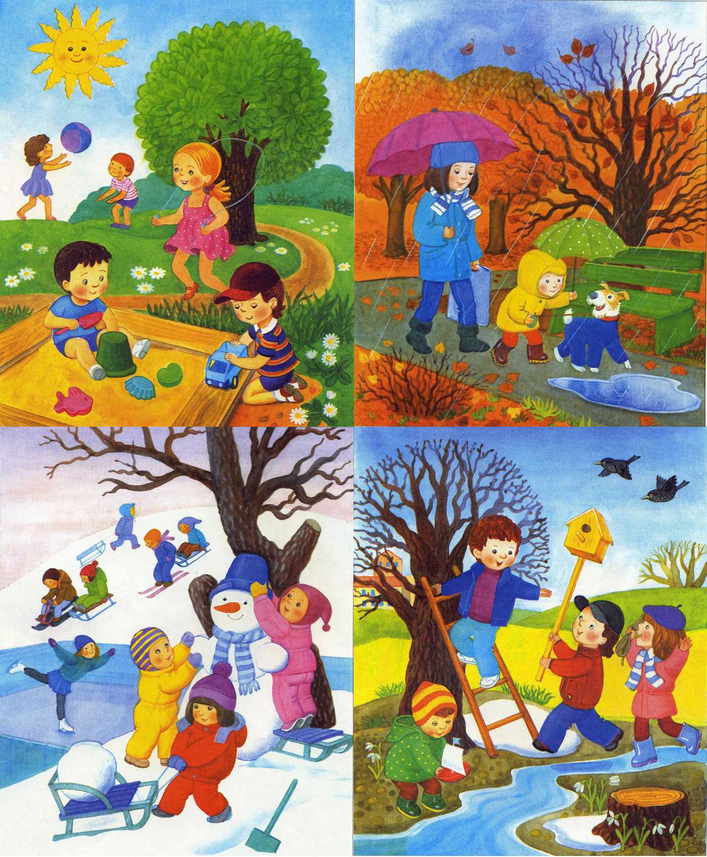- 4 красивые крупные картинки, изображающие зиму, весну, лето и осень;