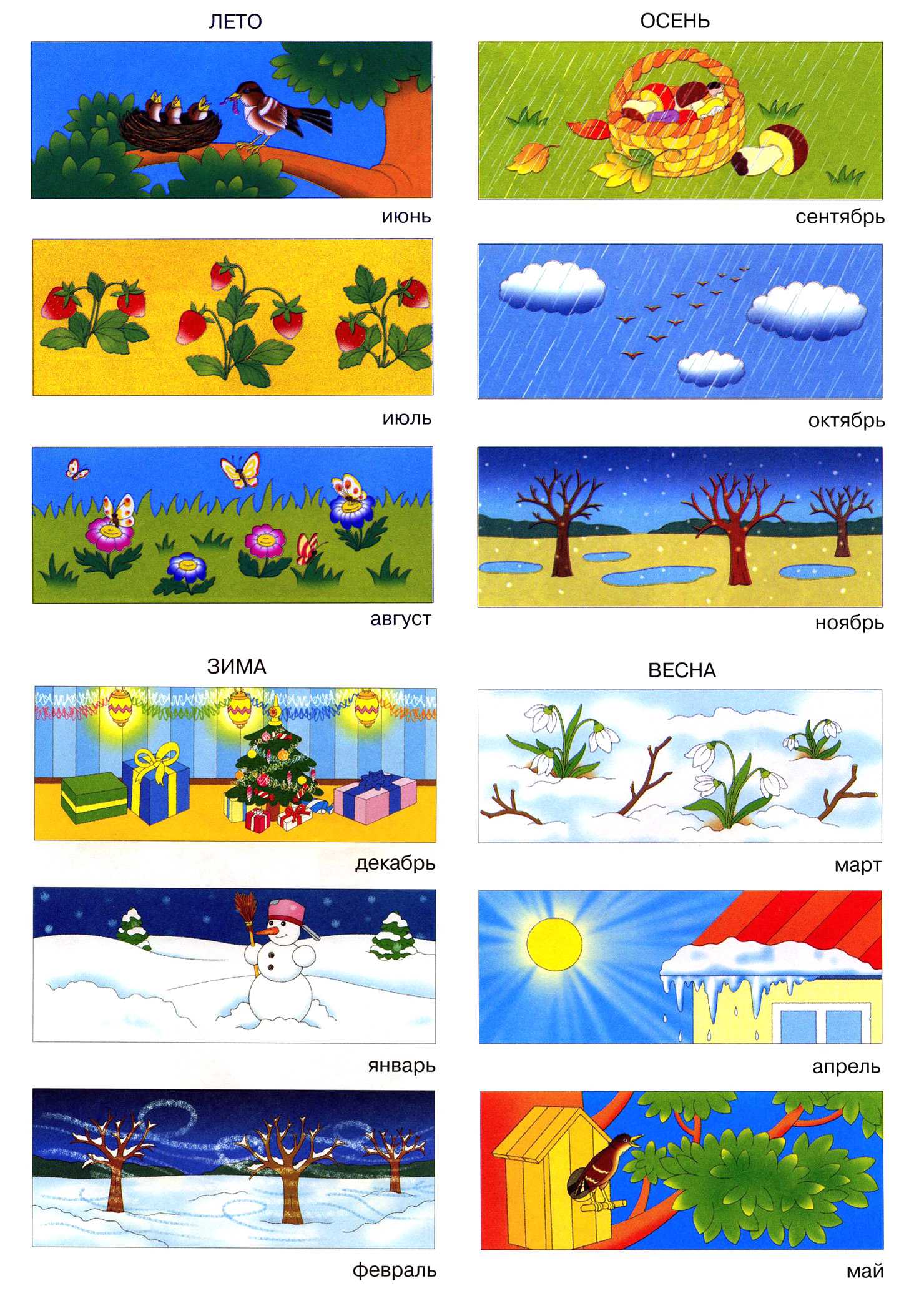 Например: январь – новогодние праздники, июль – купание в речке или на море, март – первые подснежники и тюльпаны, апрель – день рождения ребёнка (сестры, бабушки) и т.д. Постарайтесь, чтобы картинки были яркими и запоминающимися. Можно разнообразить картинки домашними фото, на которых изображён сам малыш, при этом следите, чтобы было хорошо видно, какое именно время года изображено на фотографии.