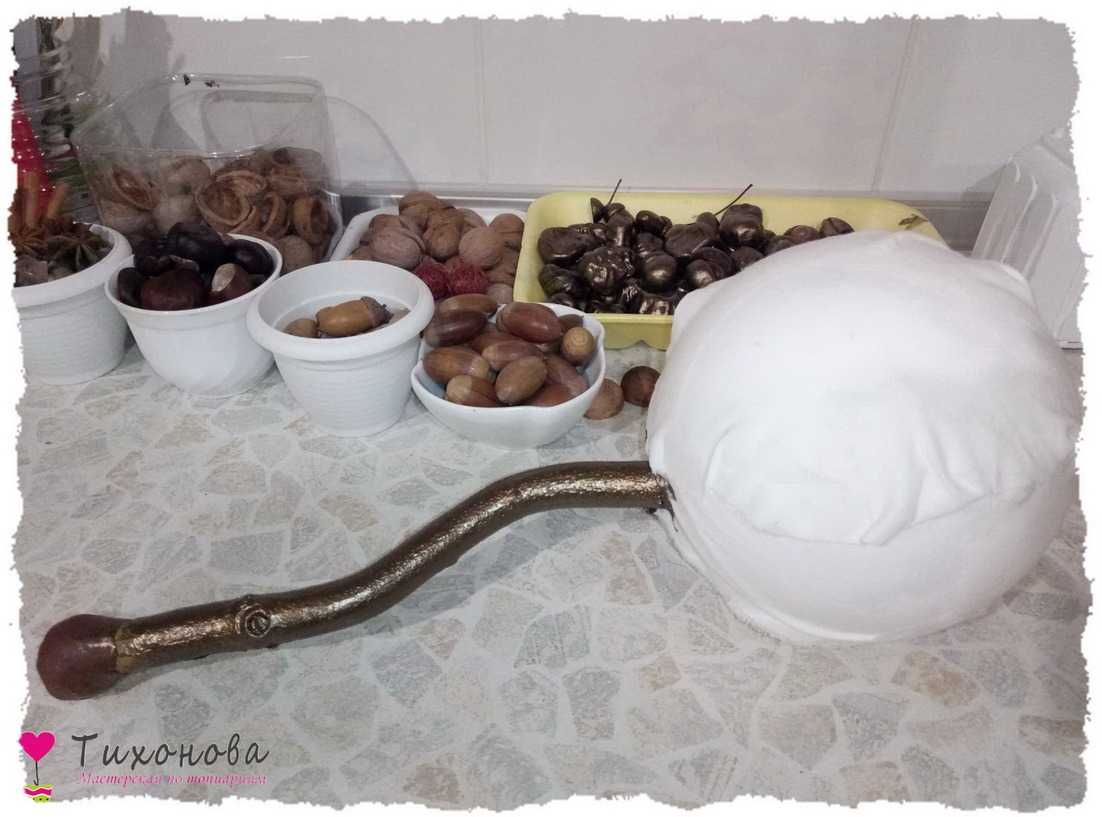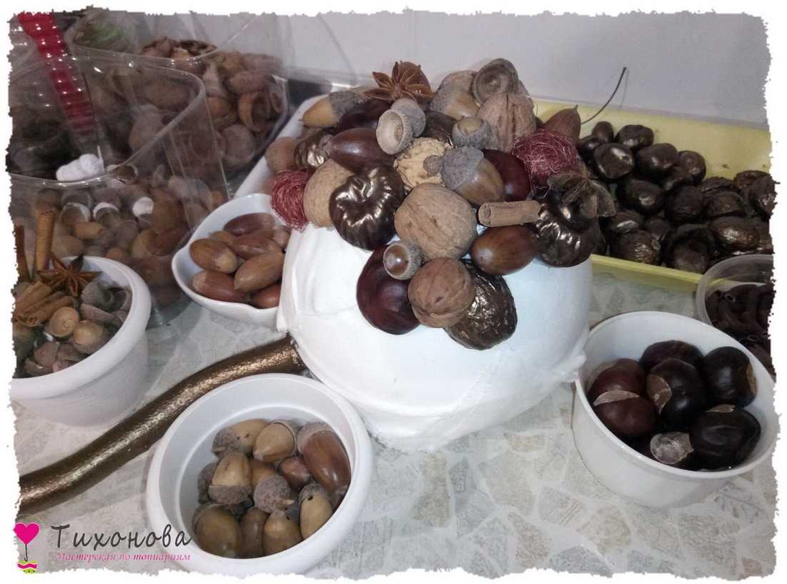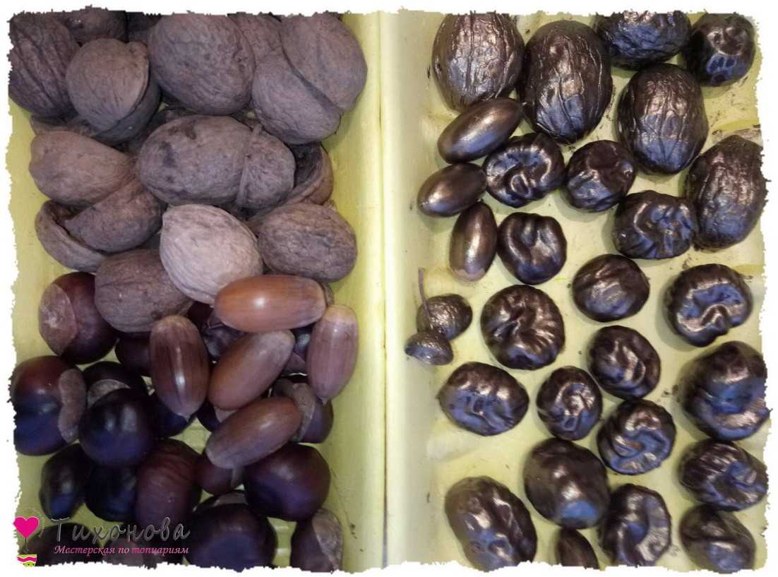 Этап 3. Покраска декора. Акриловой краской — античная бронза или среднее золото — красим высушенные каштаны, половинки грецкого ореха, желуди и шапочки.