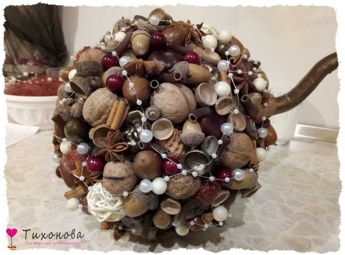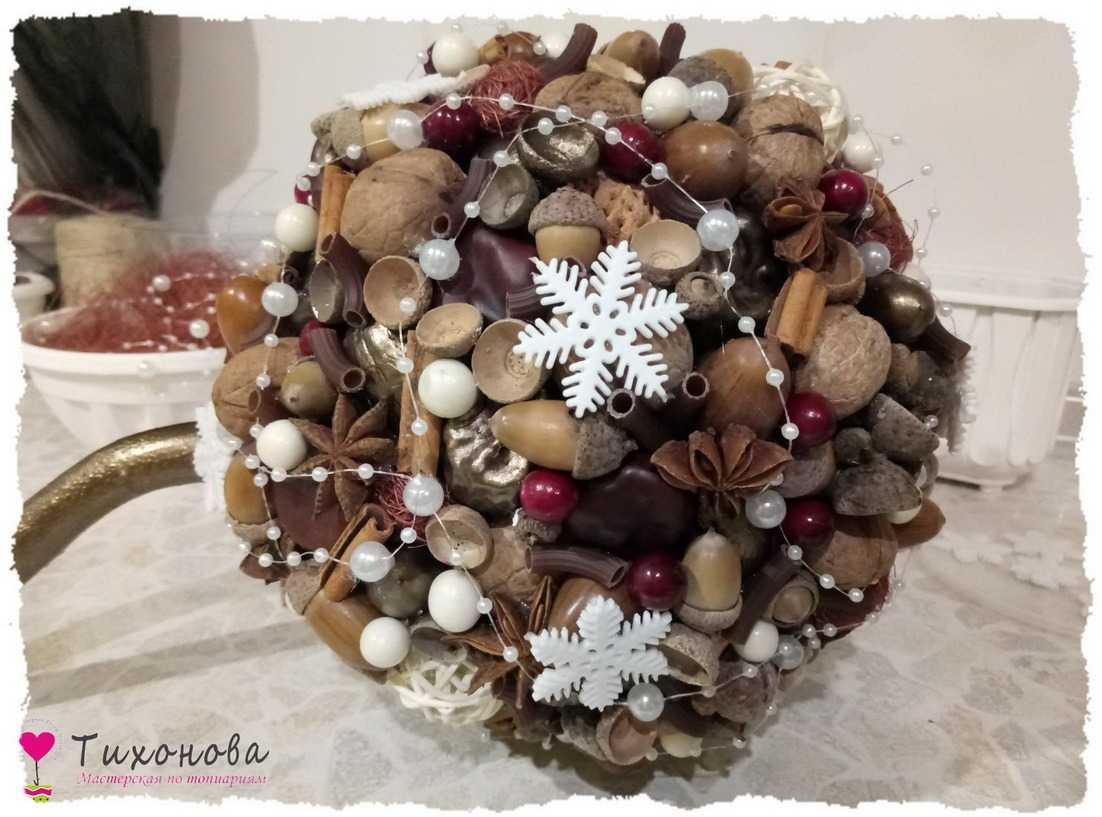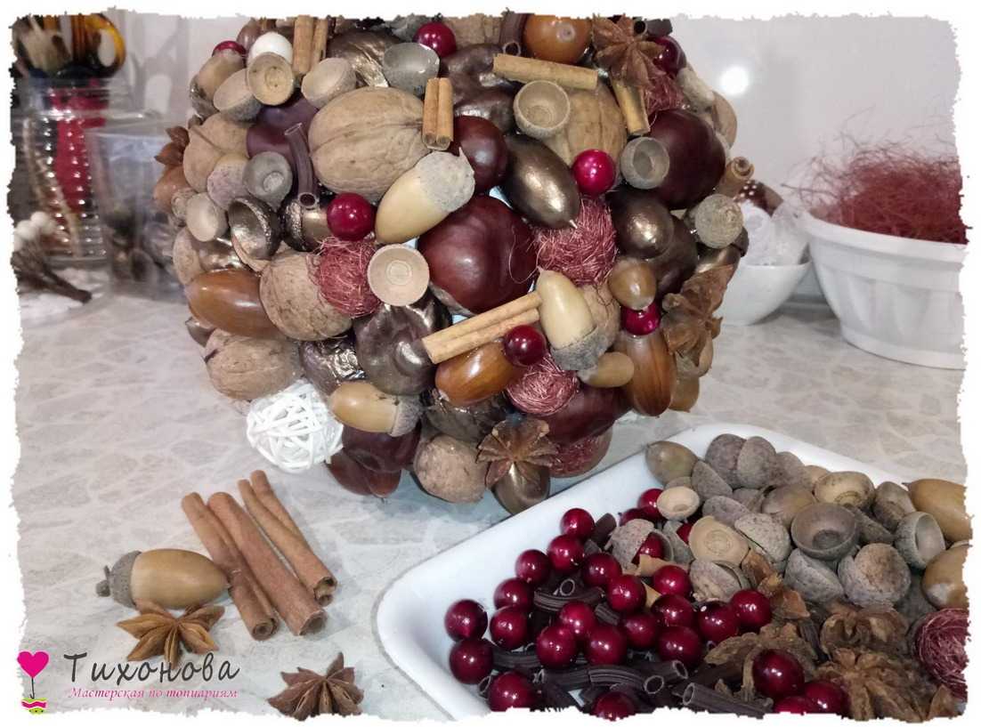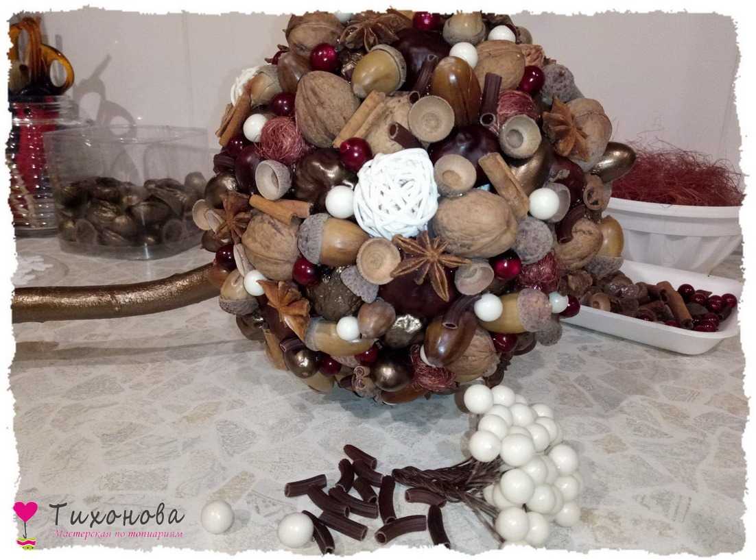 Этап 6. Декор кроны. Секрет колорита новогоднего топиария — разнообразие декора из природного материала в сочетании с искусственными элементами. По всей поверхности шара, кучно, без пробелов, приклеиваем декор, чередуя крашеные и не крашеные элементы: