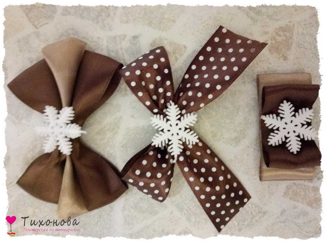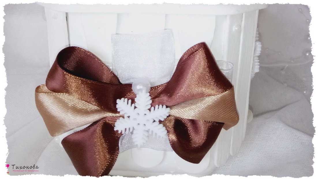 Этап 8. Атласный бант. Можно использовать готовый коричневый бант в горошек или сделать самостоятельно тройной бантик из атласных лент, как показано на видео. Под бант клеим крест-накрест петельки из белой органзы, а сверху — снежинку и бусину.