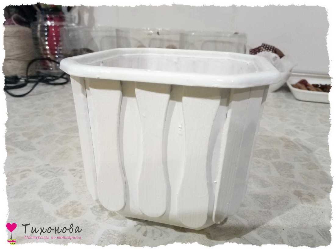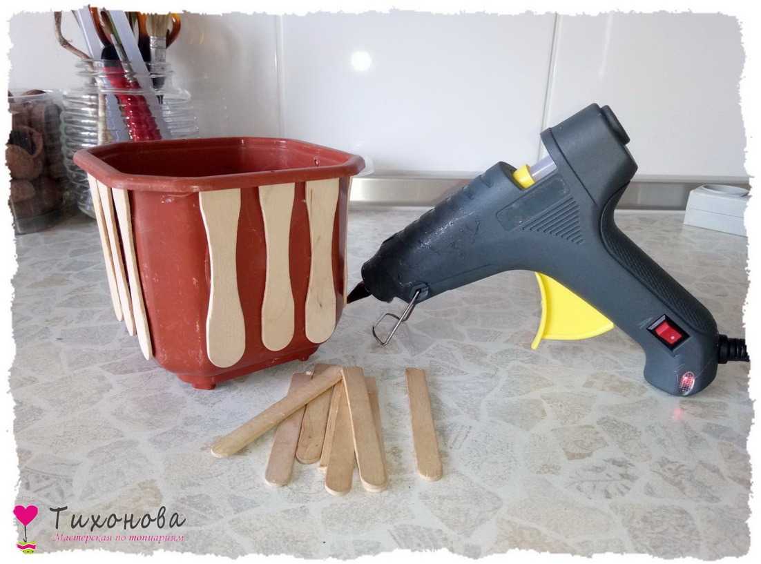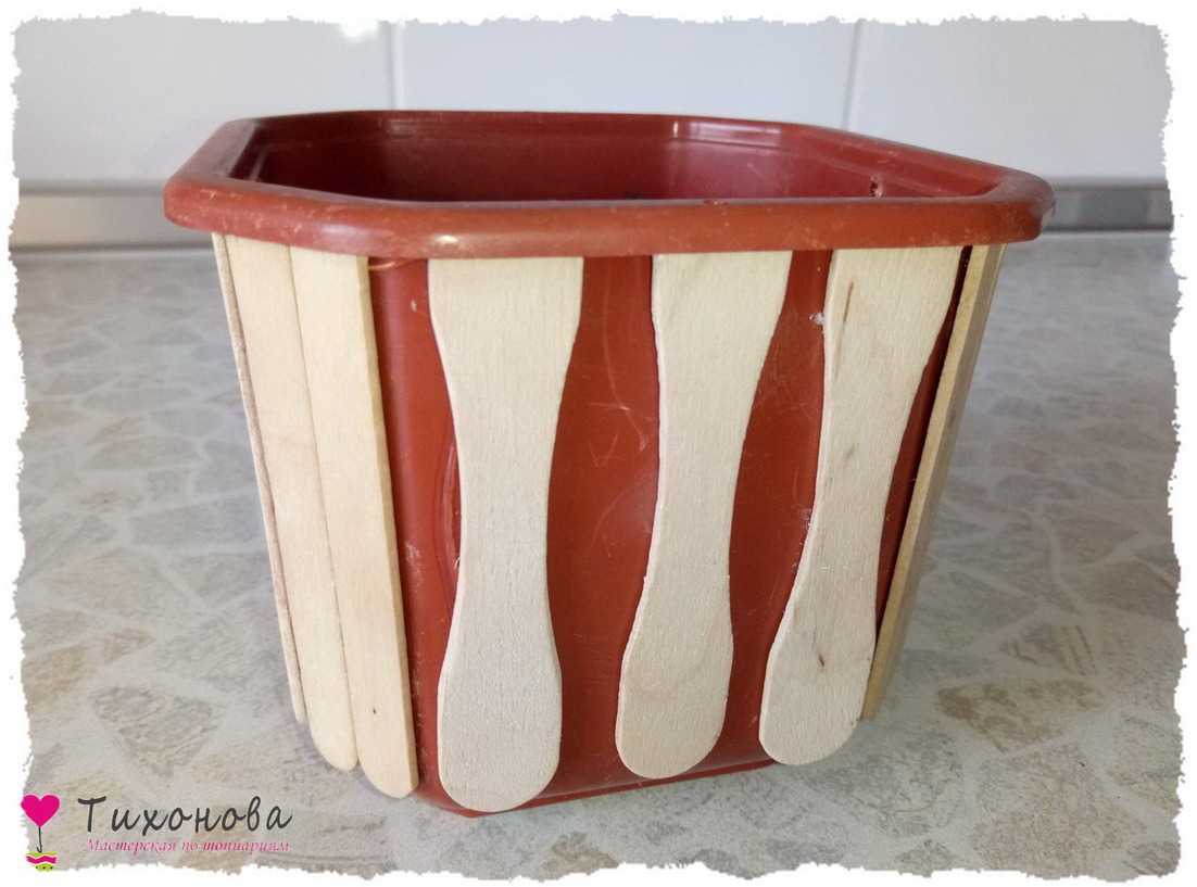 Этап 1. Поклейка палочек для мороженого. Под реставрацию подойдет любая емкость — главное, чтобы без трещин и сколов. На дно приклеиваем пластиковую крышку или аналогичное изделие: закрыть дренажные отверстия, чтобы при заливке гипс не выливался. Обклеиваем горшок палочками для мороженого: если высота не совпадает — подрезаем палочки.
