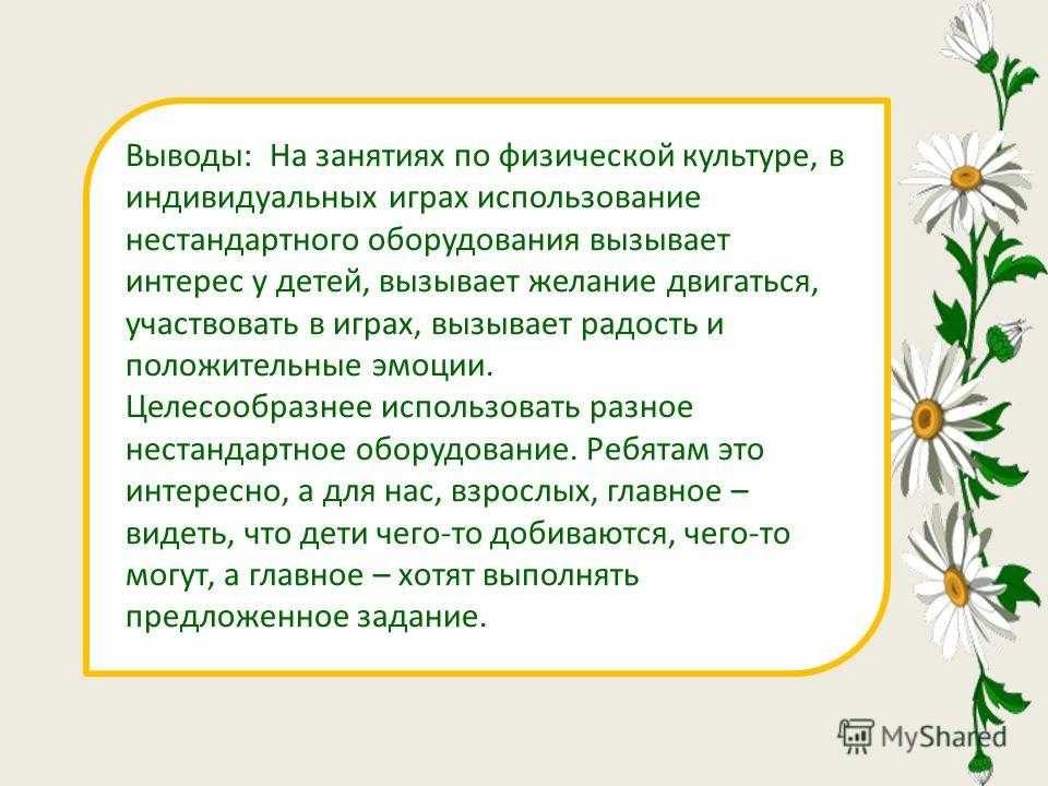 Выводы: На занятиях по физической культуре, в индивидуальных играх использование нестандартного оборудования вызывает интерес у детей, вызывает желание двигаться, участвовать в играх, вызывает радость и положительные эмоции. Целесообразнее использовать разное нестандартное оборудование. Ребятам это интересно, а для нас, взрослых, главное – видеть, что дети чего-то добиваются, чего-то могут, а главное – хотят выполнять предложенное задание.