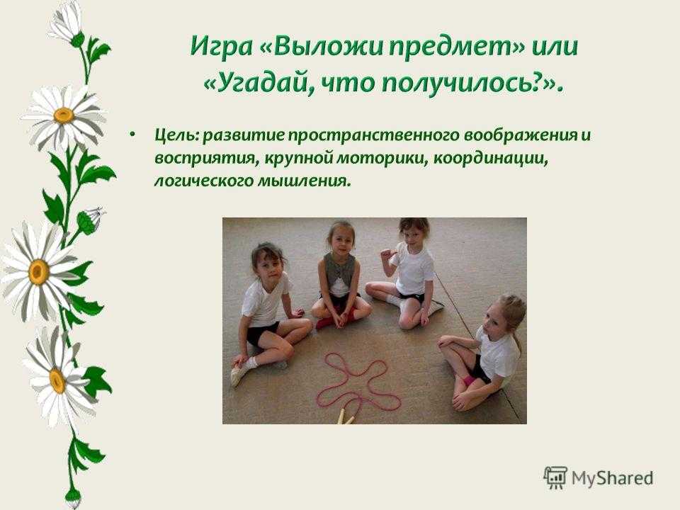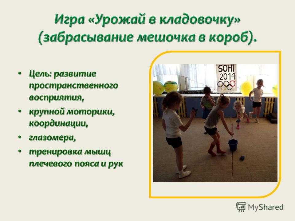Цель: развитие пространственного воображения и восприятия, крупной моторики, координации, формирование перекрестных движений, оречевление пространственных отношений, закрепление знаний цвета, формы, упражнение в прыжках и беге, развитие быстрой реакции