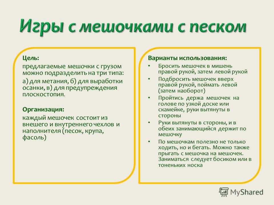 Варианты использования: Бросить мешочек в мишень правой рукой, затем левой рукой Подбросить мешочек вверх правой рукой, поймать левой (затем наоборот) Пройтись держа мешочек на голове по узкой доске или скамейке, руки вытянуты в стороны Руки вытянуты в стороны, и в обеих занимающийся держит по мешочку По мешочкам полезно не только ходить, но и бегать. Можно также прыгать с мешочка на мешочек. Заниматься следует босиком или в тоненьких носка