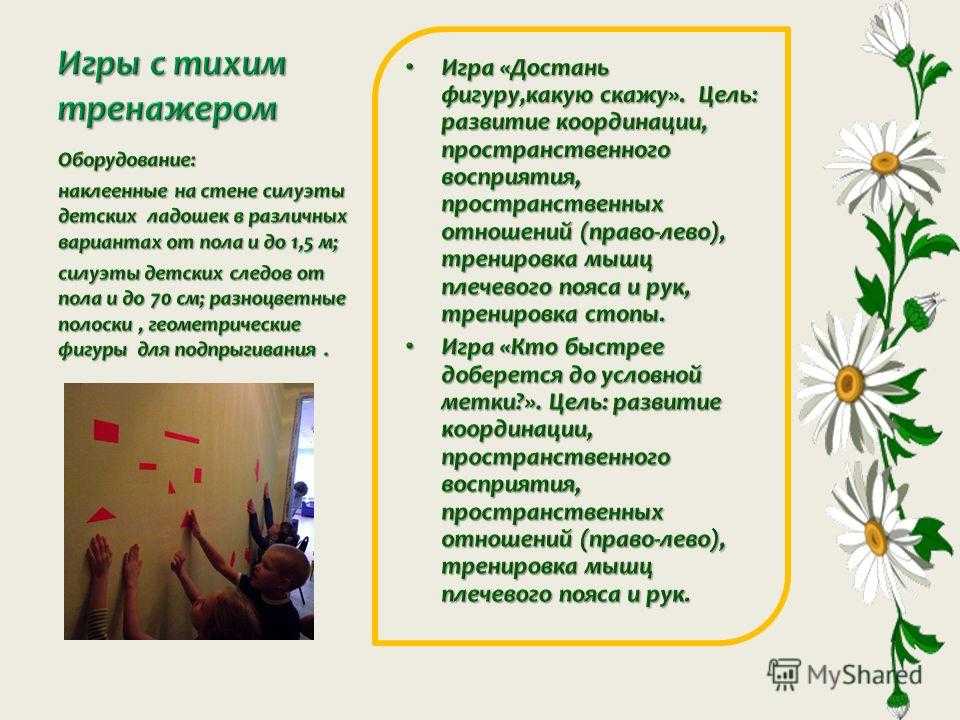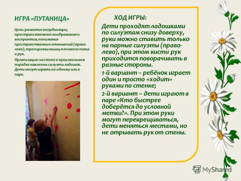 Цель: развитие координации, пространственного воображения и восприятия, понимания пространственных отношений (право- лево), тренировка мышц плечевого пояса и рук. Организация: на стене в произвольном порядке наклеены силуэты ладошек. Дети могут играть по одному или в паре.