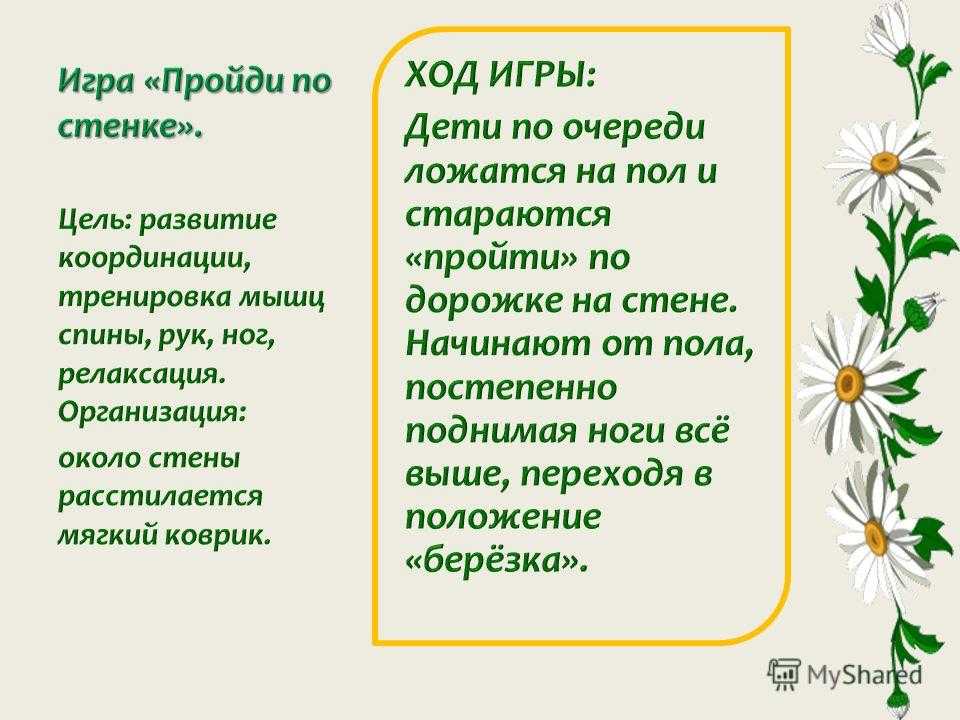 Цель: развитие координации, тренировка мышц спины, рук, ног, релаксация. Организация: около стены расстилается мягкий коврик.