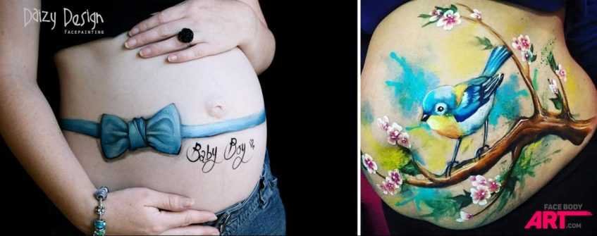 Обычно будущие мамочки обращаются к мастерам салонов перед фотосессией, желая запечатлеть необычные кадры с мужем и другими членами семейства. Профессионалы способны предложить массу вариантов бодиарта на животе беременных, будь то рисунки ребеночка в утробе, животные, смешарики, изображение земного шара со всеми континентами. Довольно популярными остаются мячи, арбузы, УЗИ-фотографии.