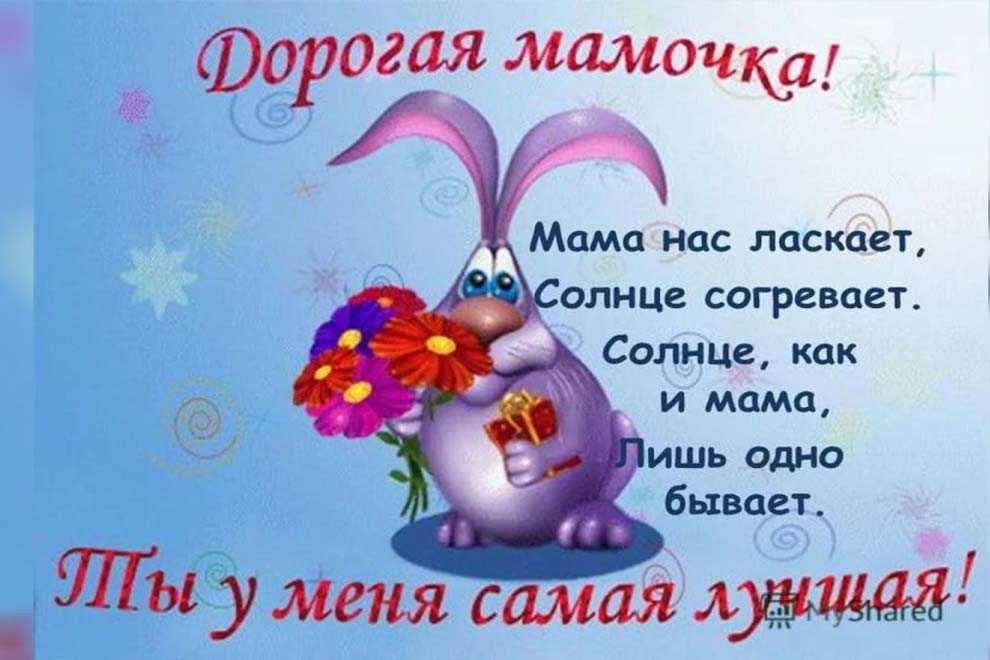 Родная мамочка моя,Хочу поздравить я тебя.Хочу сказать, как я люблюТебя, прекрасную мою.Пусть Бог хранит тебя всегда,Будь весела и молода.