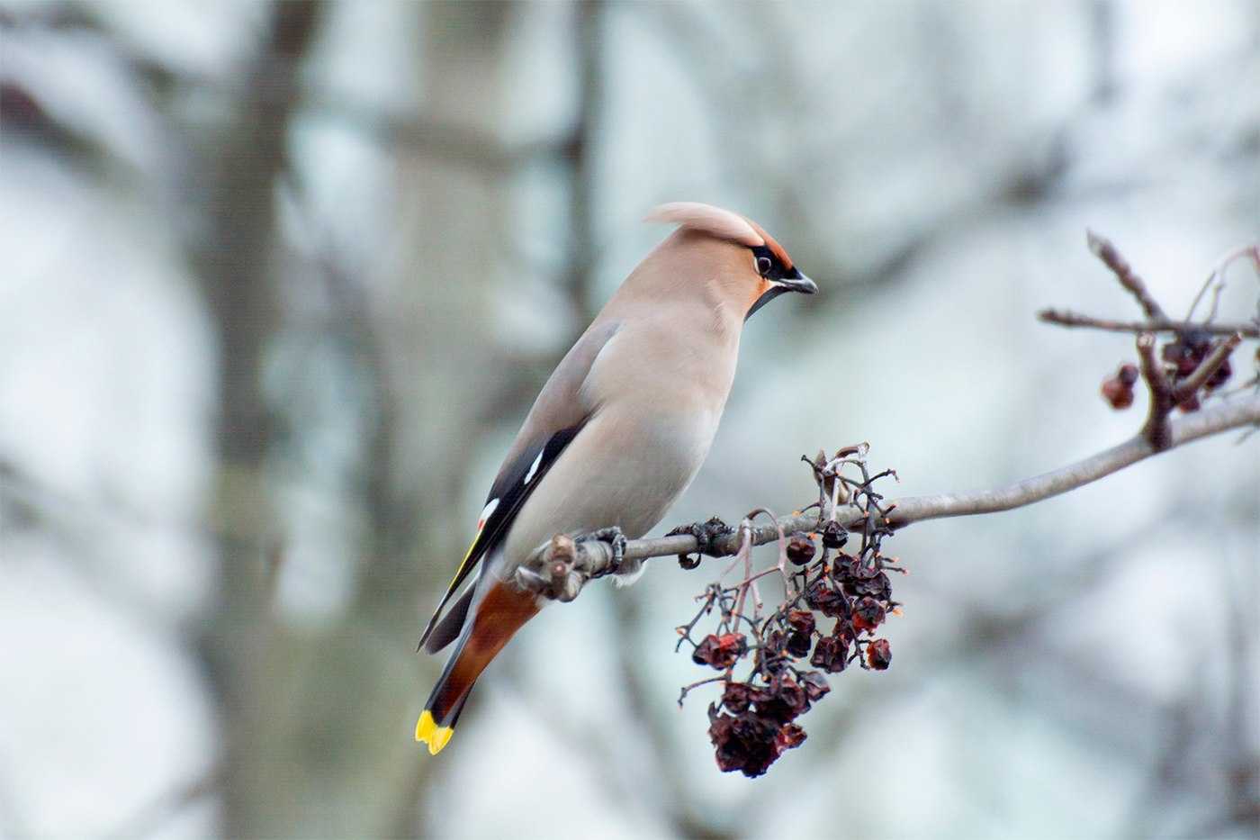 - Небольшая птичка с хохолком, зимой питается рябиной в садах.